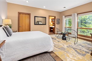 🛏️ Sleep well: Two, large ensuite Queen bedrooms with walk-in closets + Sunroom's twin daybed/trundle, all with memory-foam beds, natural linens, blackout curtains, white noise machines